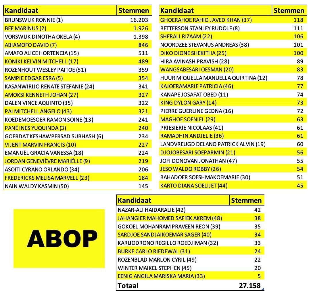 De verkiezingsuitslag van de Algemene Bevrijdings- en Ontwikkelingspartij (ABOP) toont een duidelijke overwinning voor partijleider Ronnie Brunswijk, die met 16.203 stemmen de lijst aanvoert. Zijn score alleen al maakt bijna 60% van het totaal uit, wat zijn dominante positie binnen de partij onderstreept.