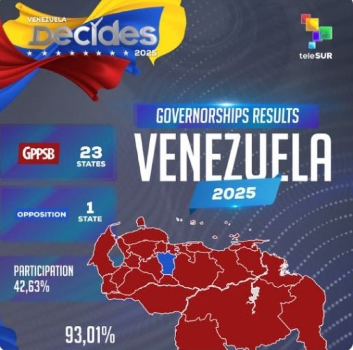 De Grote Patriottische Pool van Simon Bolivar (GPPSB), de regeringscoalitie van Venezuela, heeft een overweldigende overwinning behaald bij de recente gouverneursverkiezingen. Volgens het voorlopige resultaat van de Nationale Kiesraad (CNE) na telling van 93% van de stemmen, won de coalitie 23 van de 25 provinciale leiderschappen, een krachtig signaal van steun voor president Nicolás Maduro en de Bolivariaanse Revolutie.