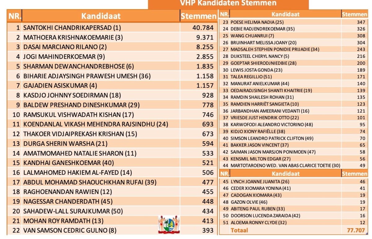 Chandrikapersad Santokhi heeft bij de verkiezingen van zondag 25 mei een verpletterende overwinning behaald. De VHP-partijleider kreeg maar liefst 40.784 stemmen achter zijn naam – goed voor ruim 52% van alle uitgebrachte stemmen. De uitslag toont echter ook grote verschillen binnen de partij, waarbij enkele kandidaten amper stemmen wisten te vergaren.