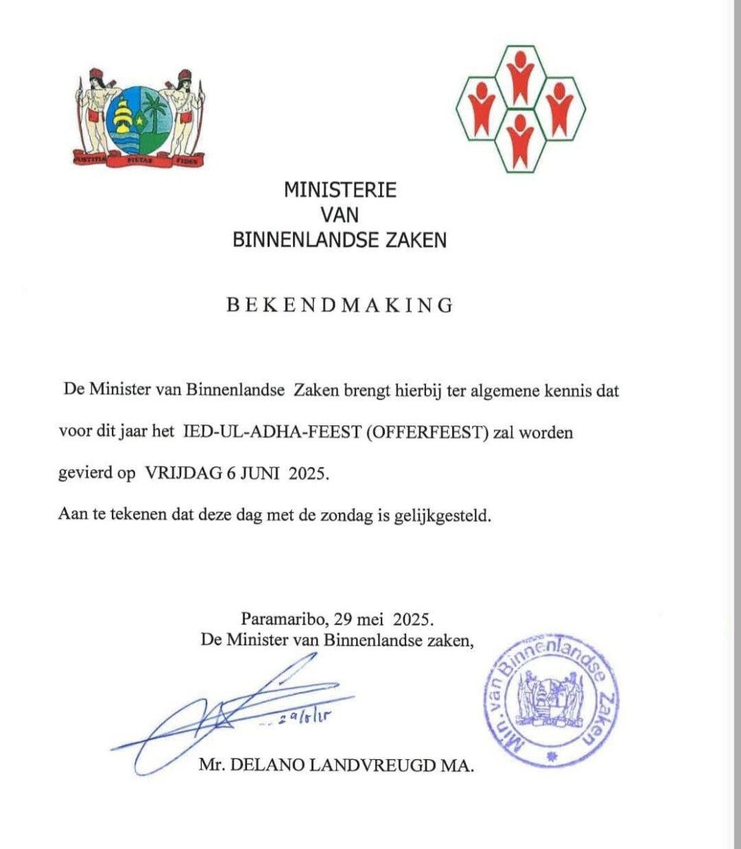 De minister van Binnenlandse Zaken heeft vandaag, donderdag 29 mei, bekendgemaakt dat dit jaar het Ied-Ul-Adha-Feest (Offerfeest) zal worden gevierd op vrijdag 6 juni..