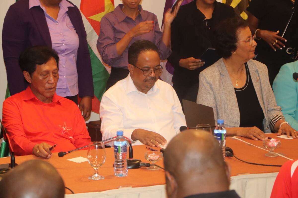 De intentieverklaring in het hotel aan de Surinamerivier werd getekend door Jennifer Simons (NDP), Gregory Rusland (NPS), Ronnie Brunswijk (ABOP), Ronny Asabina (BEP), Steven Reyme (A20) en… namens de Pertjajah Luhur door de oude Paul Somohardjo.
