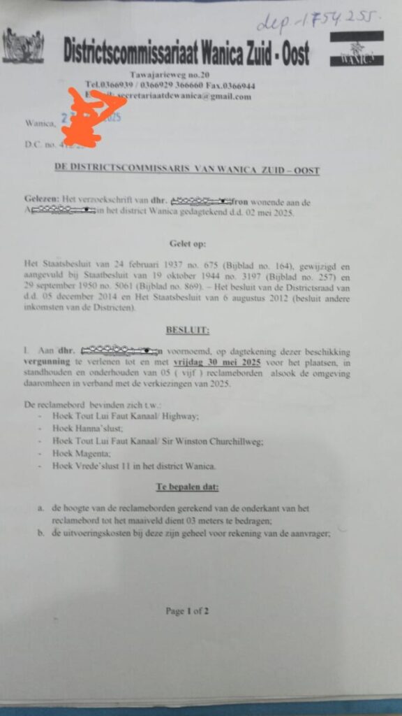 Volgens districtscommissaris Shafiek Goelaman van ressort Wanica Zuid -Oost is voor wat betreft de laatst gehouden verkiezing van 25 mei politieke partijen voorgehouden, “dat het propagandamateriaal tot 30 mei mag blijven staan. Politieke partijen zijn na die datum zelf verantwoordelijk voor het opruimen van alle propagandamateriaal“.