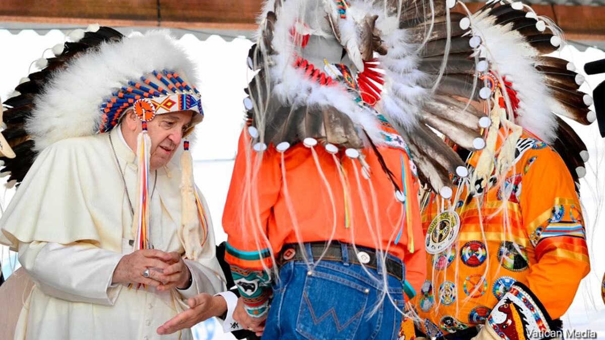 Paus Franciscus bracht in 2022 een bezoek aan de oorspronkelijke volkeren in Canada (zie foto). Hij noemde die reis een ‘pelgrimage van boetedoening’, omdat hij ging om spijt te betuigen voor het leed dat de katholieke kerk de bevolking had aangedaan.