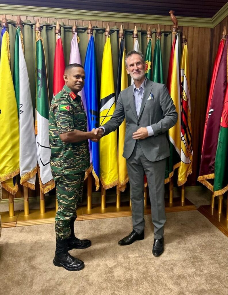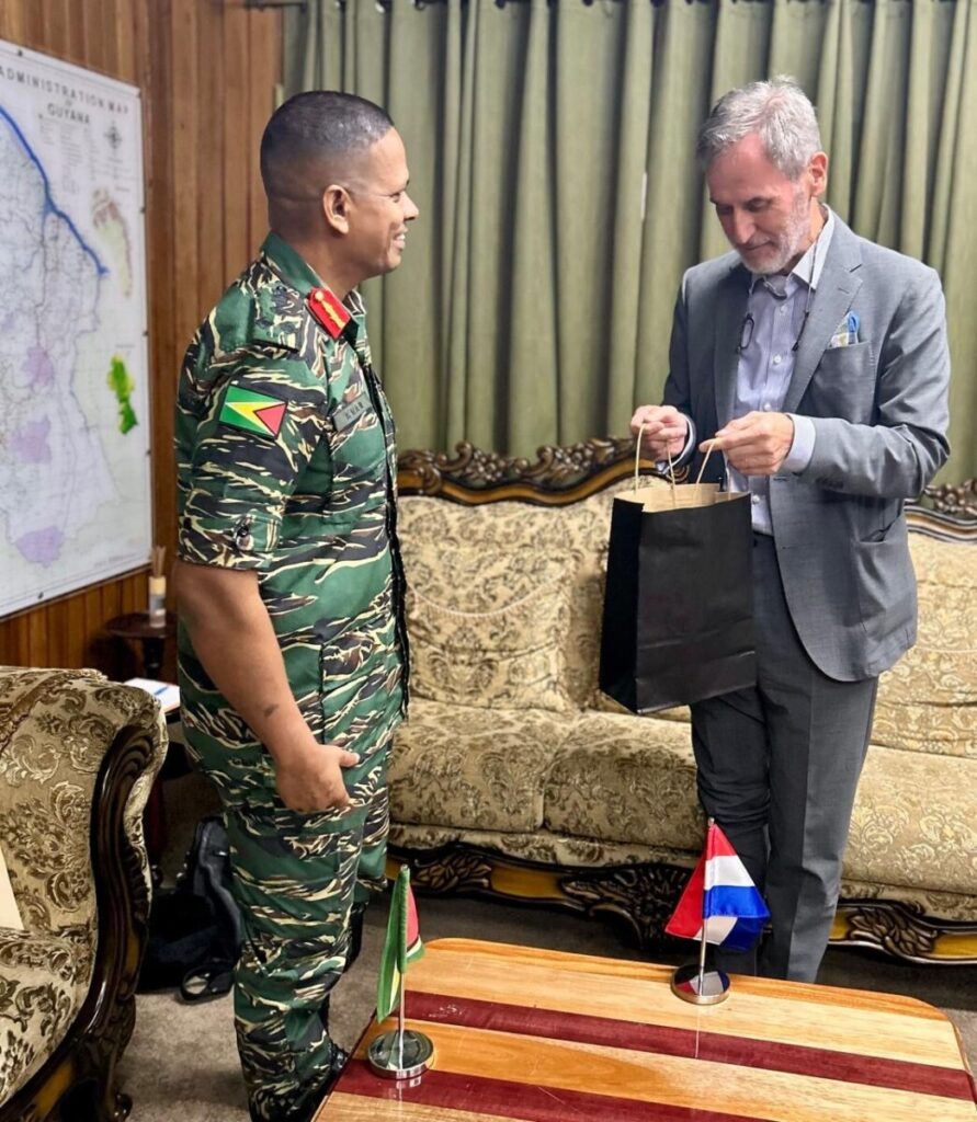 Woensdag bezochten de Nederlandse ambassadeur Walter Oostelbos en defensieattaché Kapitein-Luitenant ter Zee Geordie Klein de Chief of Defence Staff van Guyana (Brigadier Omar Khan). De samenwerking richt zich op militaire uitwisselingen, waaronder een gepland Nederlands havenbezoek aan Georgetown dit najaar. Sinds 2024 volgen ook Guyaanse militairen cursussen in Nederland over de Nederlandse krijgsmacht, NAVO en EU.