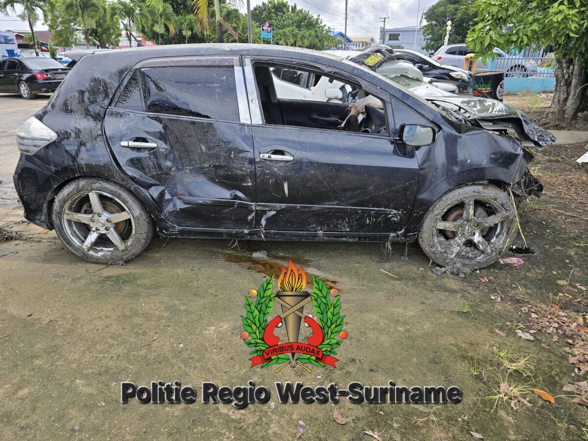 Een Toyota Blade was in een langs de D.C.B.J. Parabirsinghweg lopende trens terechtgekomen. De bestuurder, S.S. (19), kon zelfstandig uit het voertuig komen en klaagde over pijn aan zijn gehele lichaam.