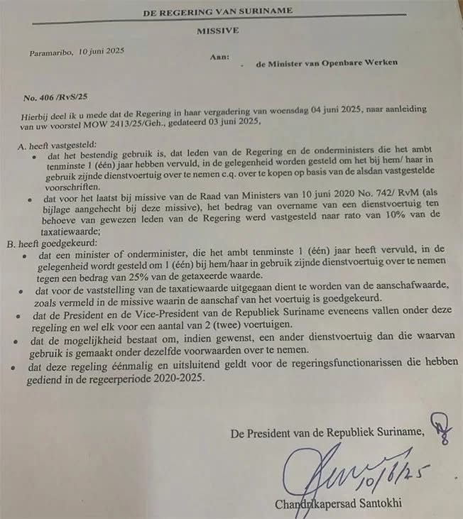 De regering van Suriname heeft tijdens haar vergadering van woensdag 4 juni een besluit genomen over de overname van dienstvoertuigen door (oud-)ministers en onderministers. Dit besluit, vastgelegd in missive No. 406/Rvs/25, biedt functionarissen die ten minste één jaar in dienst zijn geweest de mogelijkheid om hun gebruikte dienstvoertuig tegen een gereduceerd tarief over te nemen.