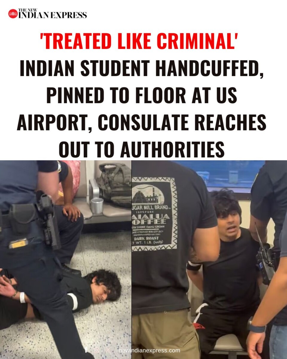 Video’s van een Indiase student die door de autoriteiten op de luchthaven van Newark in New Jersey, VS, werd geboeid en op de grond werd gedrukt voordat hij werd gedeporteerd, zijn viraal gegaan en hebben geleid tot grote verontwaardiging op sociale media.