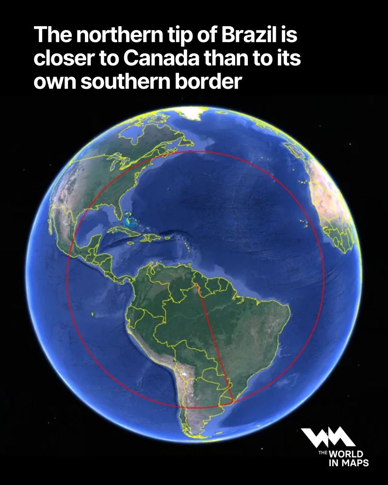 Het noordelijkste punt van Brazilië ligt dichter bij Canada dan bij de zuidelijkste punt van het land zelf.