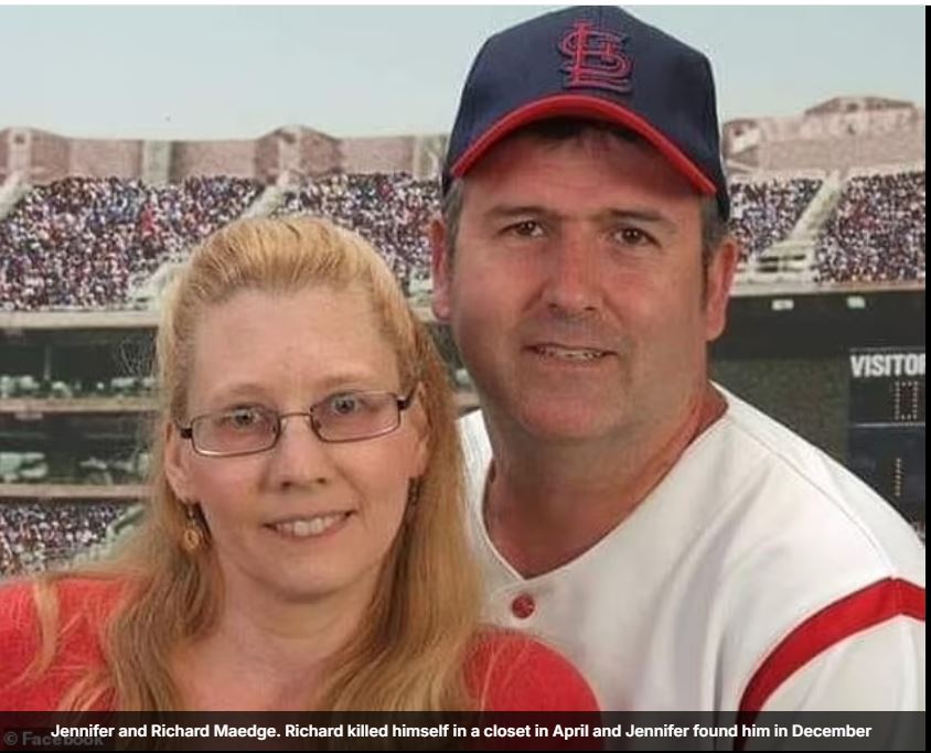 Jennifer Maedge vond het lichaam van haar man Richard in een kast in hun huis in Troy, Illinois – acht maanden nadat hij vermist werd gemeld. Richard (53) pleegde in april 2022 zelfmoord in een verborgen kast, waar zijn lichaam mummificeerde, waardoor er geen geur vrijkwam.