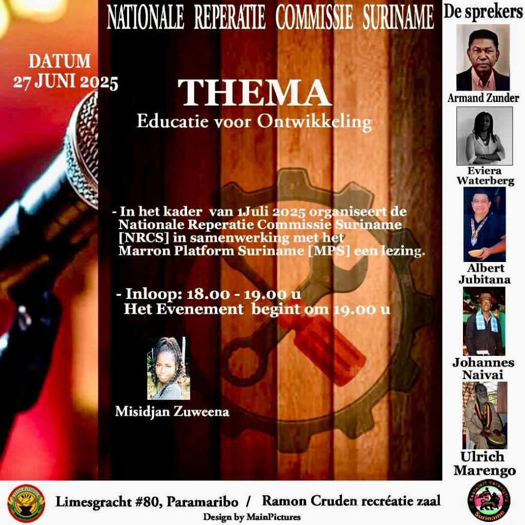 De Nationale Reparatie Commissie Suriname en de stichting Marron Awareness Platform organiseren op 27 juni aanstaande ter gelegenheid van de herdenking van 1 juli 2025 een Thema en Culturele avond. Het thema van de avond is Educatie voor Ontwikkeling. De sprekers op de avond zijn: Albert Jubithana, Rasta Congo Kwami, Kapteng Johannes Niavai, Elvira Waterberg en Armand Zunder.