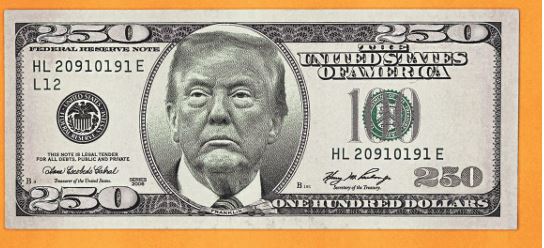 Illustratie: Een illustratie van een $250-biljet met een portret van Donald J. Trump.