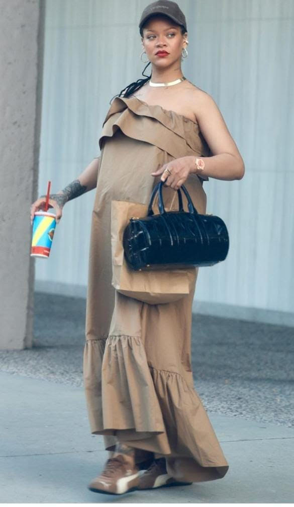 Rihanna bewijst opnieuw haar uitzonderlijke zwangerschapsstijl tijdens een casual uitstapje in L.A. de afgelopen week. Ze droeg een strapless maxi-jurk van Saint Laurent ter waarde van $3.500, elegant maar lekker los, gecombineerd met haar comfortabele en betaalbare Puma Speedcat‐sneakers à $100.