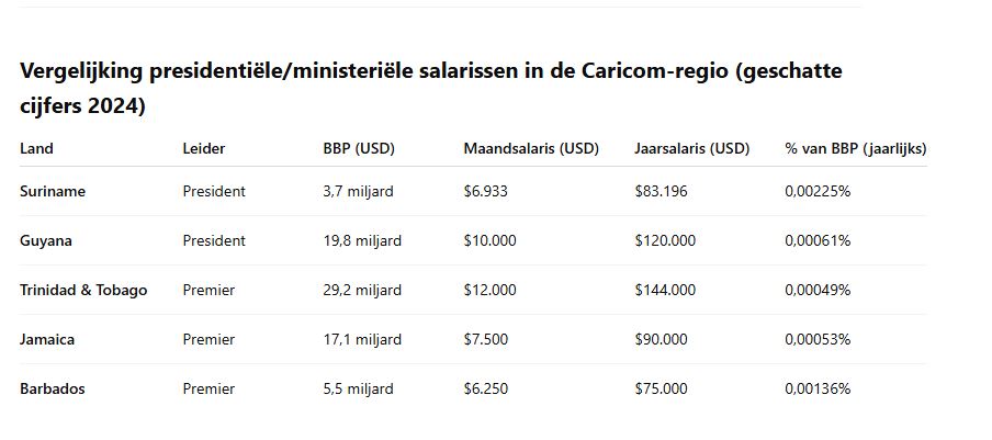 Een regionale vergelijking toont opvallende verschillen met andere Caricom-leiders, wanneer men de salarissen afzet tegen het bruto binnenlands product (BBP) per land.