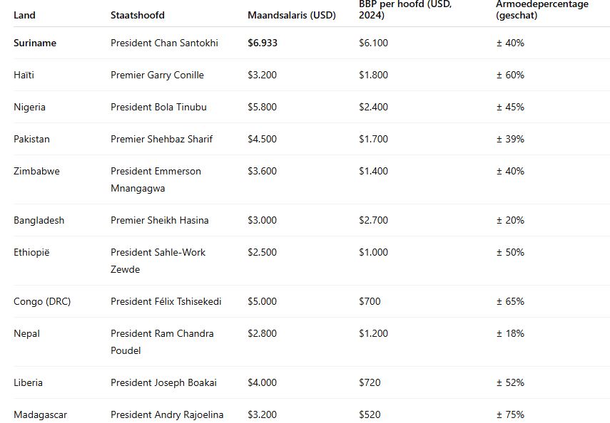 De gegevens zijn gebaseerd op openbare bronnen en schattingen uit 2024. De cijfers geven een indicatie van de inkomensverhoudingen van staatshoofden in landen waar het merendeel van de bevolking in armoede leeft.