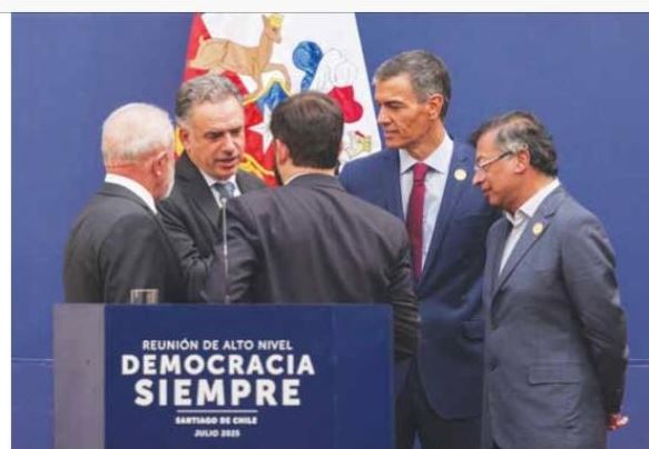 De linkse leiders van Spanje en vier Zuid-Amerikaanse landen kwamen gisteren bijeen in Santiago, Chili, om op te roepen tot eenheid tegen het Amerikaanse protectionisme en de opkomst van extreemrechts. Onder het motto “Altijd Democratie” veroordeelden ze desinformatie, haat, corruptie en ongelijkheid. De Chileense president Gabriel Boric waarschuwde dat democratie wereldwijd onder druk staat. De bijeenkomst met onder anderen president Lula da Silva (Brazilië), Gustavo Petro (Colombia), Yamandú Orsi (Uruguay) en premier Pedro Sánchez (Spanje) benadrukte het belang van multilateralisme en mensenrechten. Boric waarschuwde ook dat sommige landen de top als vijandige boodschap aan de VS zouden kunnen zien. Een Brits denktank had recent gewaarschuwd dat 50% van de democratieën wereldwijd bedreigd worden. De leiders zeiden dat dit hét moment is om democratie wereldwijd te versterken. Leiders van Mexico, het VK en Canada waren uitgenodigd, maar konden niet aanwezig zijn.