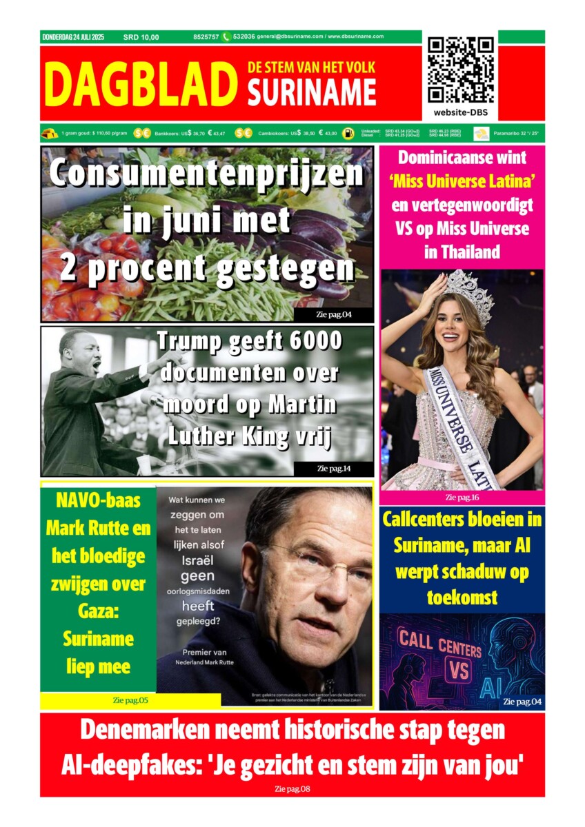 Dagblad Suriname, donderdag 24 juli 2025 Geplaatst op juli 24, 2025juli 23, 2025 Bericht navigatie VorigeKPS: Boetes voor verkeersovertredingen aangepastVolgendePrijzen donderdag 24 juli 2025