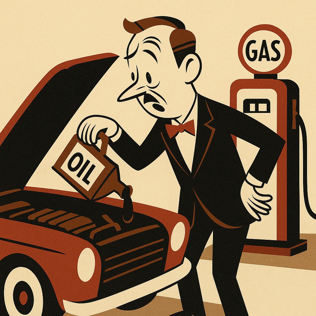 En ik… ik schoot onbedoeld in de lach. Niet omdat ik leedvermaak had (oké, misschien een beetje), maar omdat het zo absurd was: van privilege naar pomp, van beleidsnota’s naar olievlekken op je hand. De pompbediende moest hem zelfs uitleggen dat olie niet via de uitlaat gaat.
