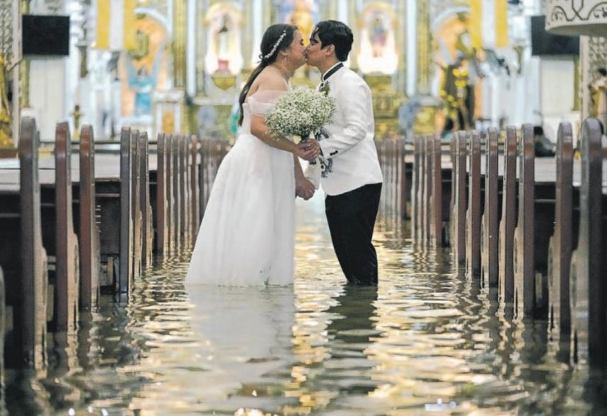 Ondanks zware overstromingen veroorzaakt door tyfoon Wipha, stapten Jade Rick Verdillo en Jamaica Aguilar vorige week dinsdag toch in het huwelijksbootje. Hun trouwlocatie, de historische Barasoain-kerk in Malolos (Bulacan, Filipijnen), stond gedeeltelijk onder water na aanhoudende moessonregens.
