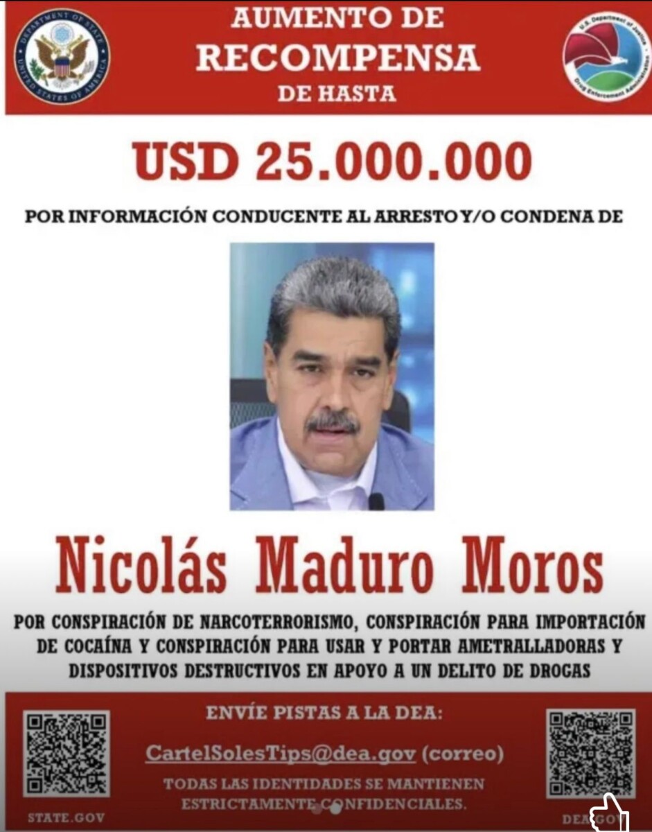 De Amerikaanse DEA heeft op 28 juli de beloning voor de arrestatie of veroordeling van Nicolás Maduro verhoogd naar $25 miljoen. De Venezolaanse president wordt beschuldigd van narcoterrorisme, cocaïnehandel en het inzetten van zware wapens. Samen met Diosdado Cabello wordt hij gezien als leider van het Cartel van de Zon, dat nauwe banden zou hebben met het Mexicaanse Sinaloa-kartel en de Venezolaanse bende Tren de Aragua.