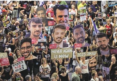 In Tel Aviv protesteerden honderden mensen, waaronder familieleden van gijzelaars, met foto’s van hun dierbaren en borden met teksten als “Nooit meer is nu” en “2025 is nu”.