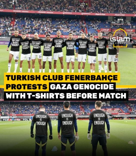 Voorafgaand aan hun wedstrijd tegen Feyenoord in Nederland heeft de Turkse club Fenerbahçe tijdens de warming-up t-shirts gedragen met de teksten “Stop crimes against humanity” en “Enough is enough”. Met deze actie protesteerden de spelers tegen de aanhoudende genocide in Gaza.