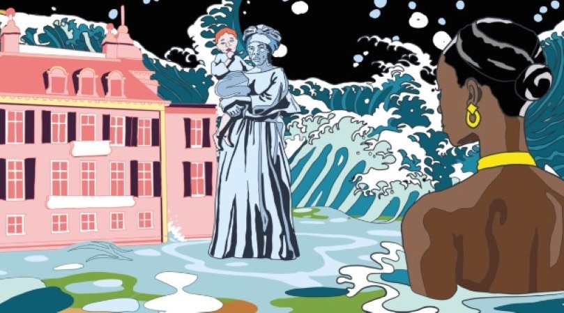 Voor dit wandkleed beeldt hij onder meer het verhaal uit van Anna van Vossenburg, een meisje dat op een Surinaamse plantage werd geboren en als kind in slavernij naar Nederland werd gebracht. Anna kwam terecht in Arnhem, waar ze opgroeide als dienstmeisje — haar geschiedenis is één van de vele die nu letterlijk met draad en naald wordt verteld.