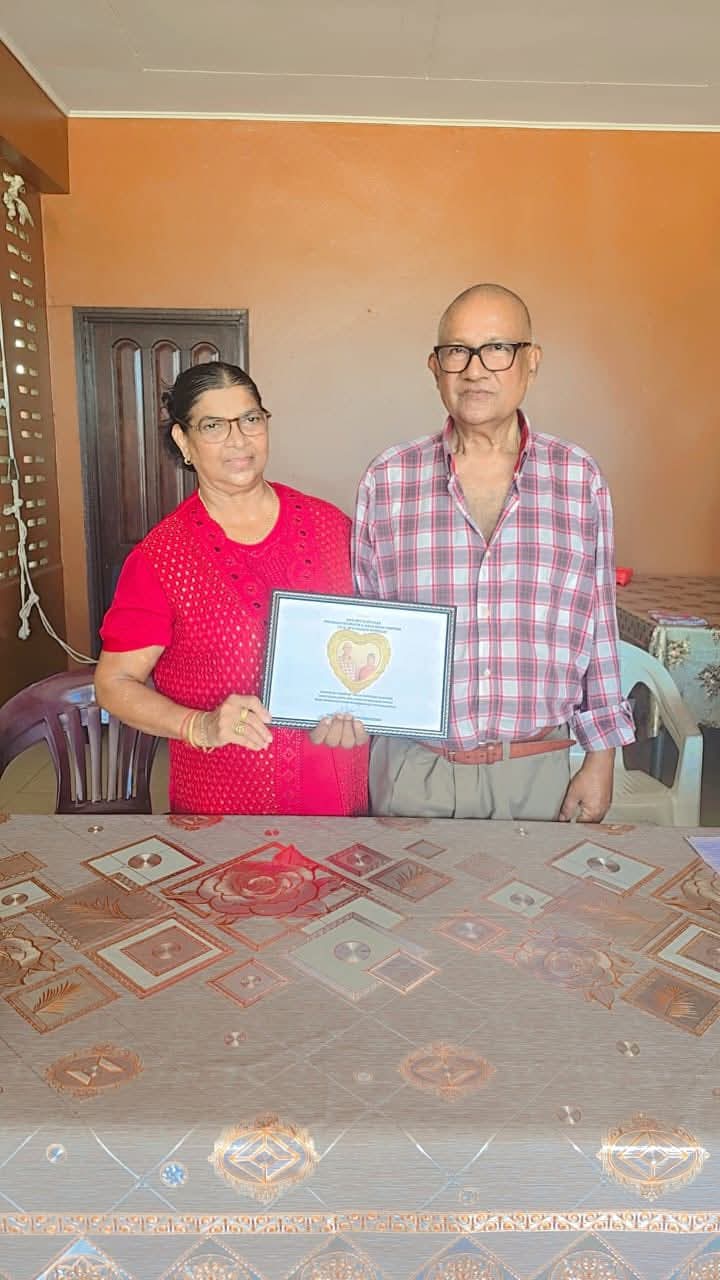 De heer Premnath Persad en zijn vrouw Sabitrie Balkaran vierden zaterdag 16 augustus hun 50e huwelijksjaar in het district Saramacca. Het echtpaar dat vier kinderen, dertien kleinkinderen en een achterkleinkind heeft, werd gefeliciteerd door regeringsvertegenwoordigers.