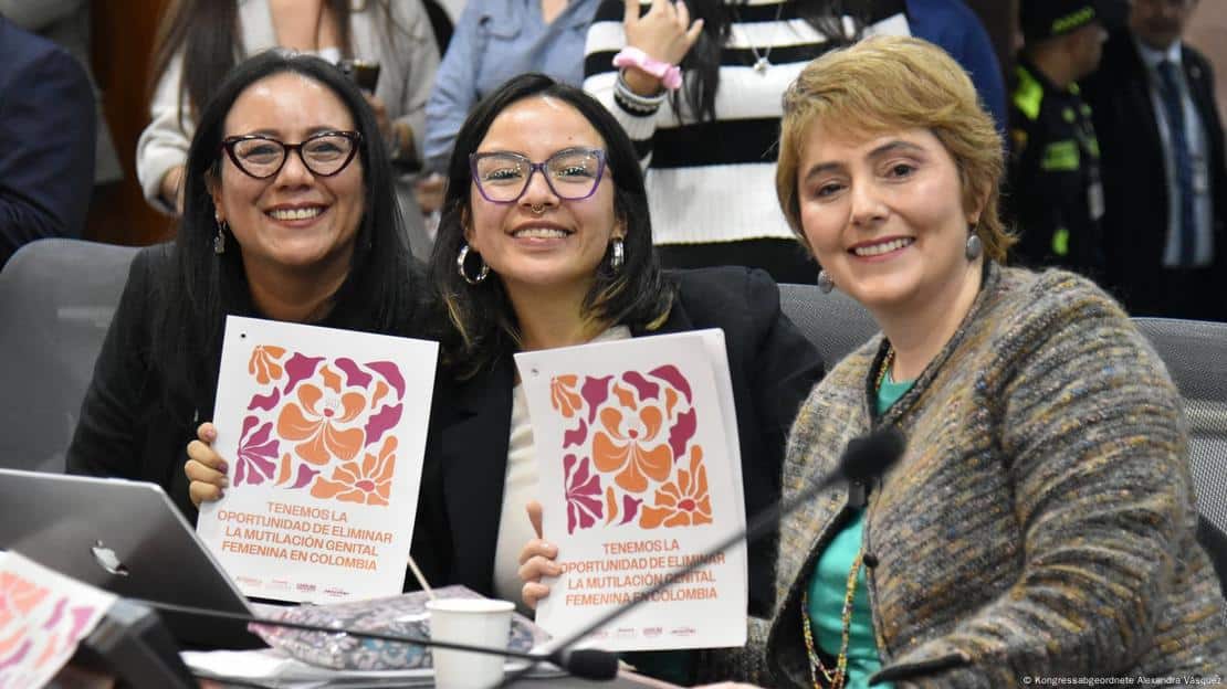 Het is belangrijk om op te merken dat, ondanks Colombia’s wetgevingsinitiatief ter zake, de kwestie veel complexer is, aangezien inheemse gemeenschappen hun eigen jurisdictie binnen hun grondgebied hebben. (Foto: Congreslid Alexandra Vásquez (links) en Jennifer Perdaza (midden) werkten beiden aan wetsvoorstel dat einde moet maken aan vrouwelijke genitale verminking. Foto: Congreslid Alexandra Vásquez)