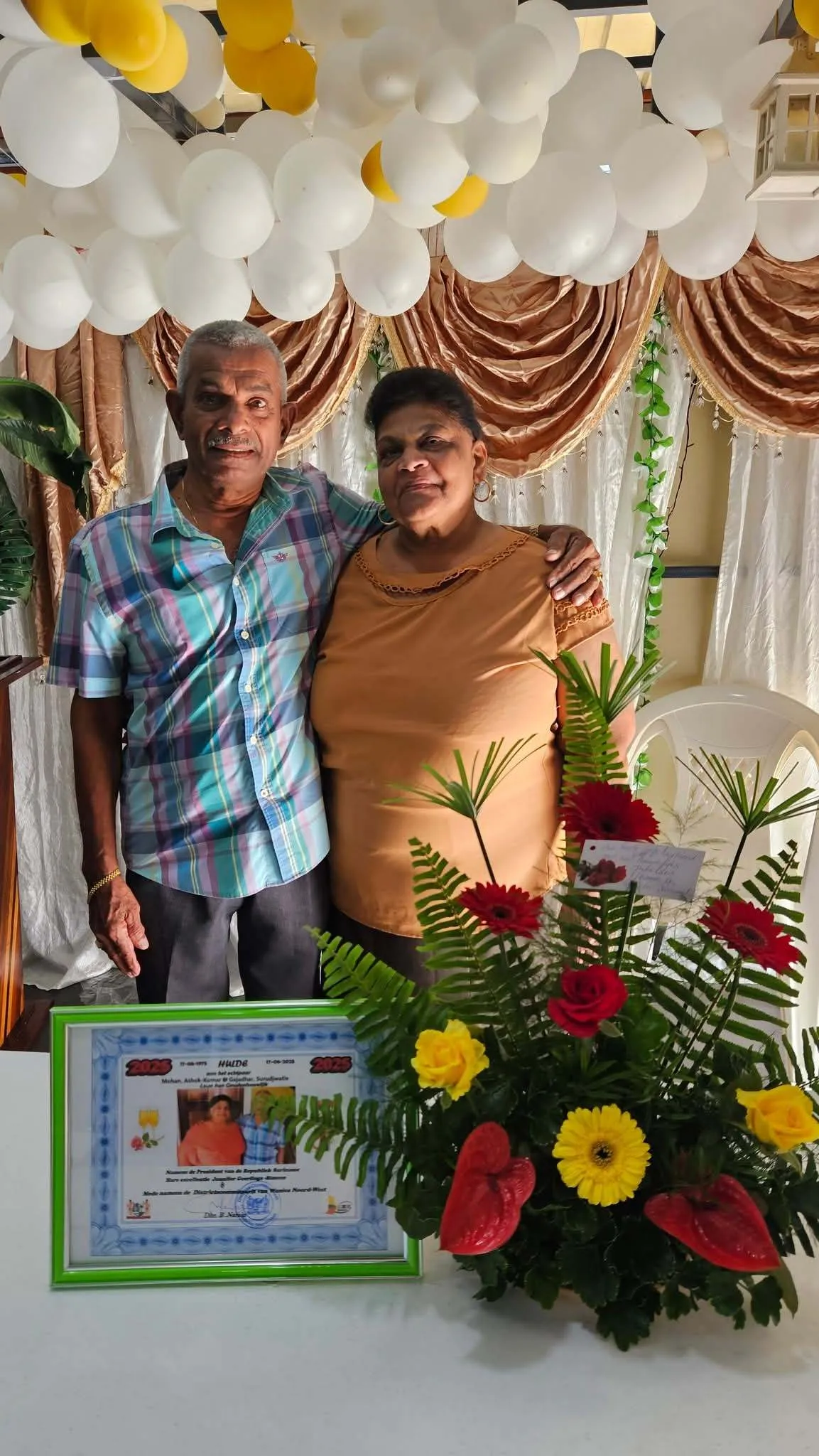 Tijdens de viering ontvingen zij de felicitaties namens de regeringsvertegenwoordiger van het Commissariaat Wanica Noord-West, die het echtpaar een bloemstuk, een fotolijst en de gebruikelijke gesloten enveloppe met inhoud als teken van waardering voor hun langdurige huwelijk overhandigde.