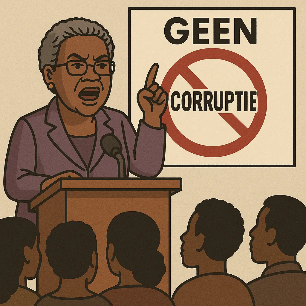 Tijdens de begrotingsbehandeling van 2025 vorige week heeft president Jennifer Simons het onderwerp corruptie nadrukkelijk op de agenda geplaatst. Zij waarschuwde haar ministers dat deelname aan corruptieve handelingen niet zonder gevolgen zal blijven. Wie zich schuldig maakt, kan volgens haar rekenen op vervolging door de procureur-generaal. Simons benadrukte dat zij een zero tolerance-beleid zal voeren, omdat zij het volk eerlijk bestuur heeft beloofd.