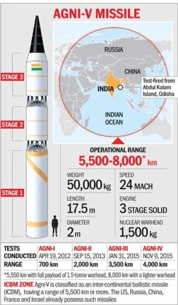 Volgens het Center for Strategic and International Studies Missile Defense Project heeft de raket een bereik van meer dan 5.000 kilometer. Daarmee vallen Indiase rivalen zoals China en Pakistan ruim binnen het bereik van het wapen.