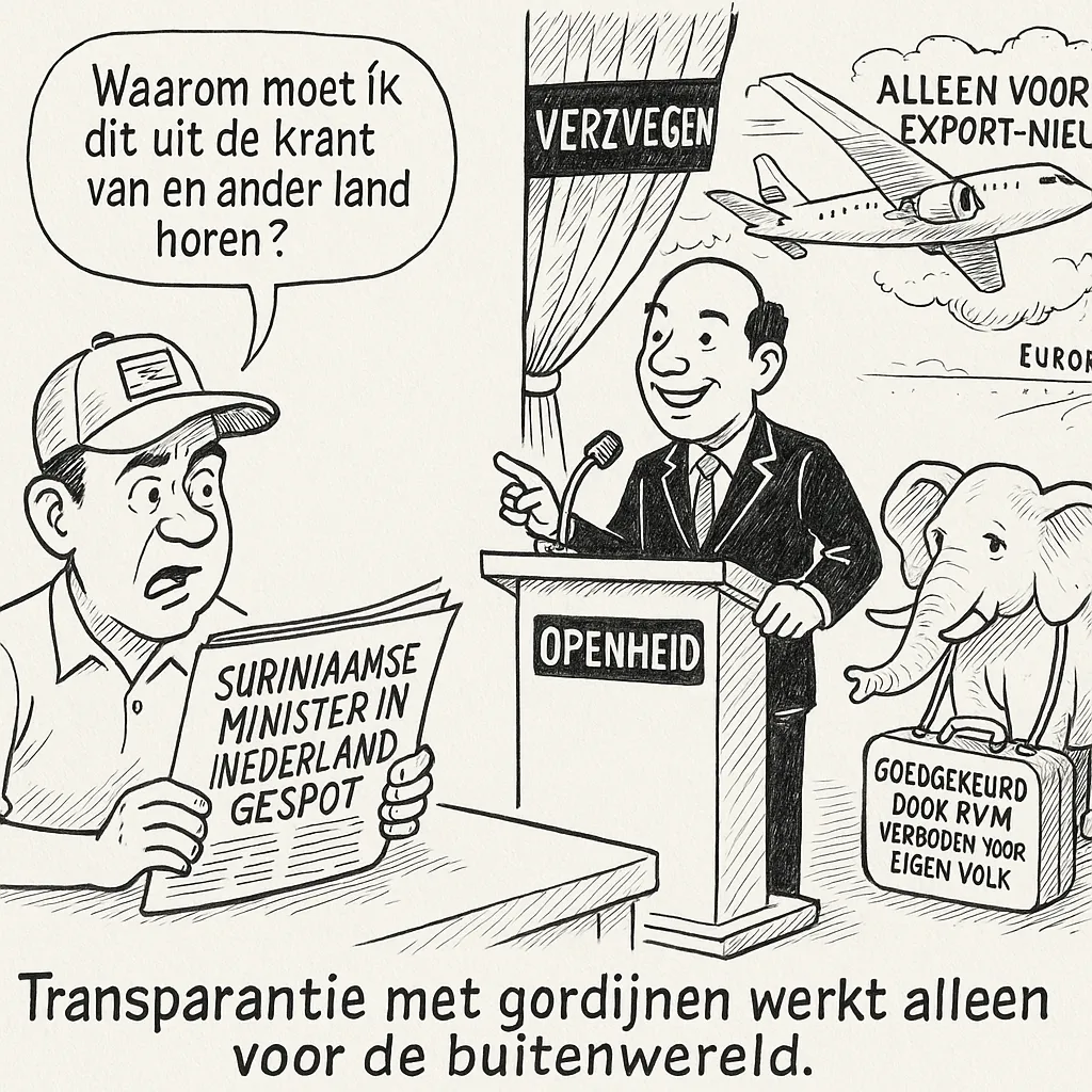 Waarom moeten Surinamers via buitenlandse kanalen vernemen dat een bewindspersoon op dienstreis is, terwijl dit op de wekelijkse persconferentie van de vicepresident onvermeld blijft? Dienstreizen worden bovendien vooraf door de Raad van Ministers goedgekeurd. Toch heerst er een merkbare terughoudendheid om het eigen volk tijdig te informeren.