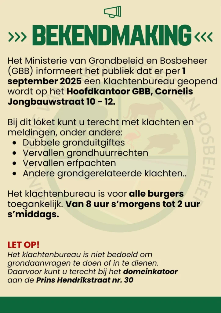 Met ingangvan 1 september opent het ministerie van Grondbeleid en Bosbeheer (GBB) een speciaal Klachtenbureau aan de Cornelis Jongbawstraat 10-12.