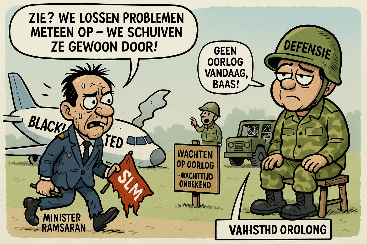 Het politieke wonderrecept in Suriname blijkt dus: falen in portefeuille A? Dan promoveer je gewoon naar portefeuille B. In dit geval van luchtvaartchaos naar legergroen. Want waarom rekenschap afleggen, als je net zo makkelijk kunt verstoppen achter de vlag en het volkslied? Intussen worstelt het land nog steeds met een geblokkeerde luchtvaartsector en een nationale luchtvaartmaatschappij die al jaren meer op een noodlandingsbaan lijkt dan op een vliegende trots.