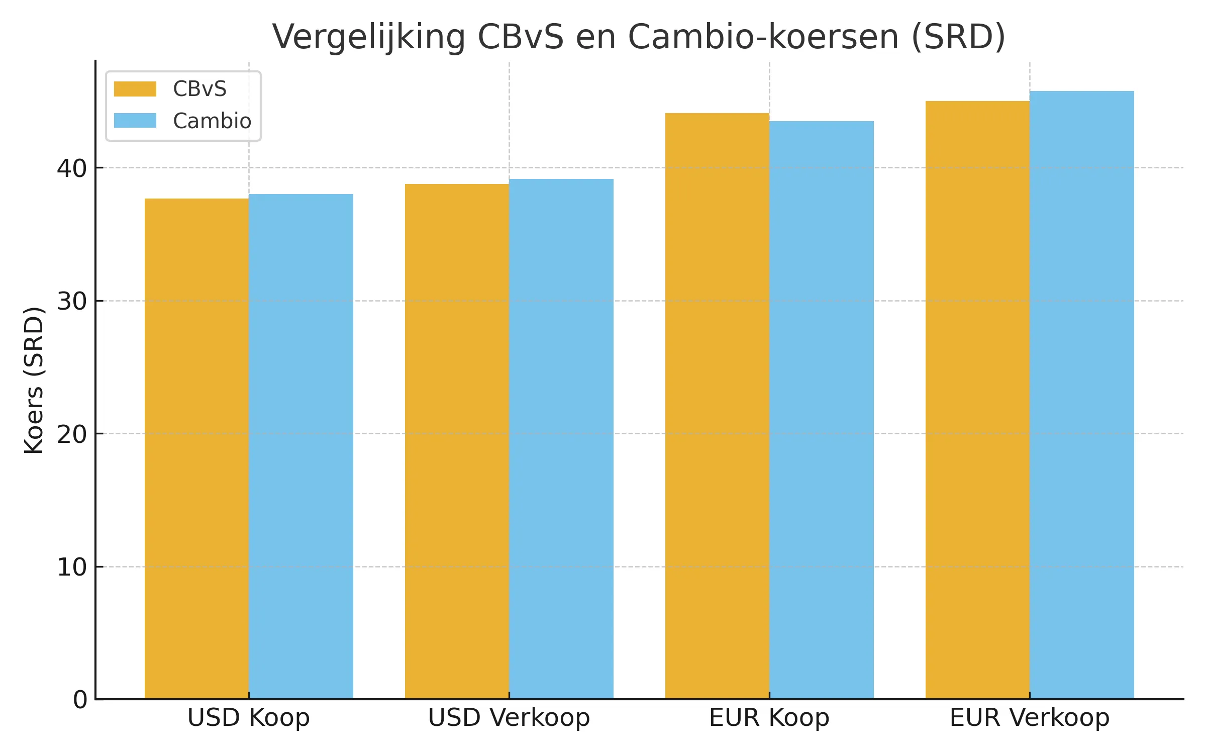 De wisselkoersen bij de commerciële cambio’s wijken duidelijk af van die van de Centrale Bank van Suriname (CBvS). Voor de Amerikaanse dollar betaalt de consument bij de cambio meer: de koopkoers ligt op SRD 38,00 tegenover SRD 37,67 bij de CBvS, terwijl de verkoopkoers SRD 39,15 bedraagt tegen SRD 38,78 bij de CBvS.