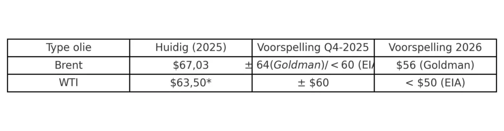 Ook de Amerikaanse Energy Information Administration (EIA) voorziet een prijsdaling. Brent wordt verwacht onder de $60 te zakken in het laatste kwartaal van 2025, terwijl de Amerikaanse WTI-olie in 2026 zelfs onder de $50 per vat kan uitkomen.