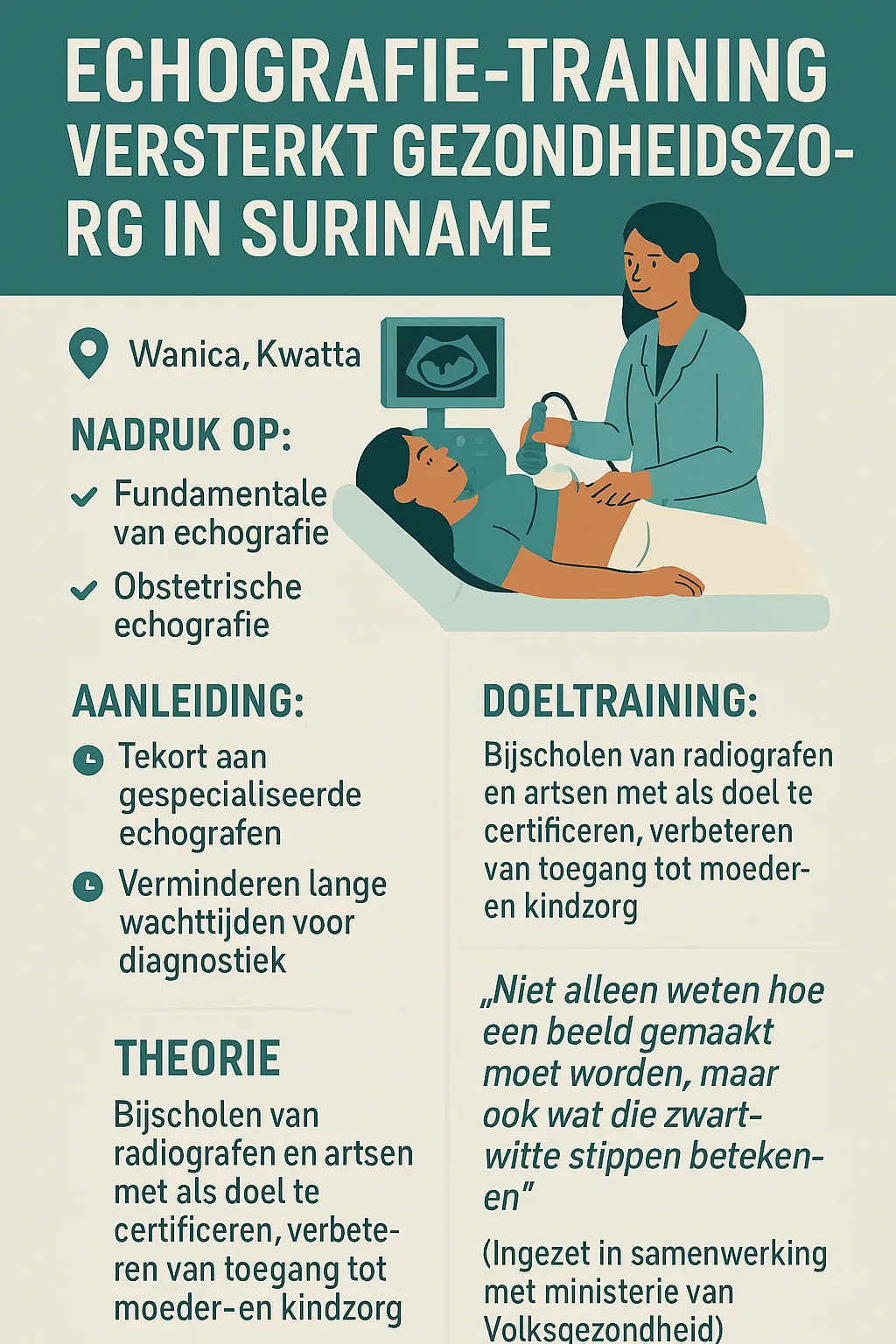 In een gezamenlijke inspanning om de kwaliteit van de gezondheidszorg in Suriname te verbeteren, is recent met de ondersteuning van de PAHO )Pan-American Health Organization) een intensieve training gestart voor radiologen en artsen, gericht op echo’s in het eerste trimester van de zwangerschap. De training, die bestaat uit webinars en praktijkgerichte sessies, heeft als doel de kennis en vaardigheden van zorgverleners te vergroten en uiteindelijk te leiden tot certificering.