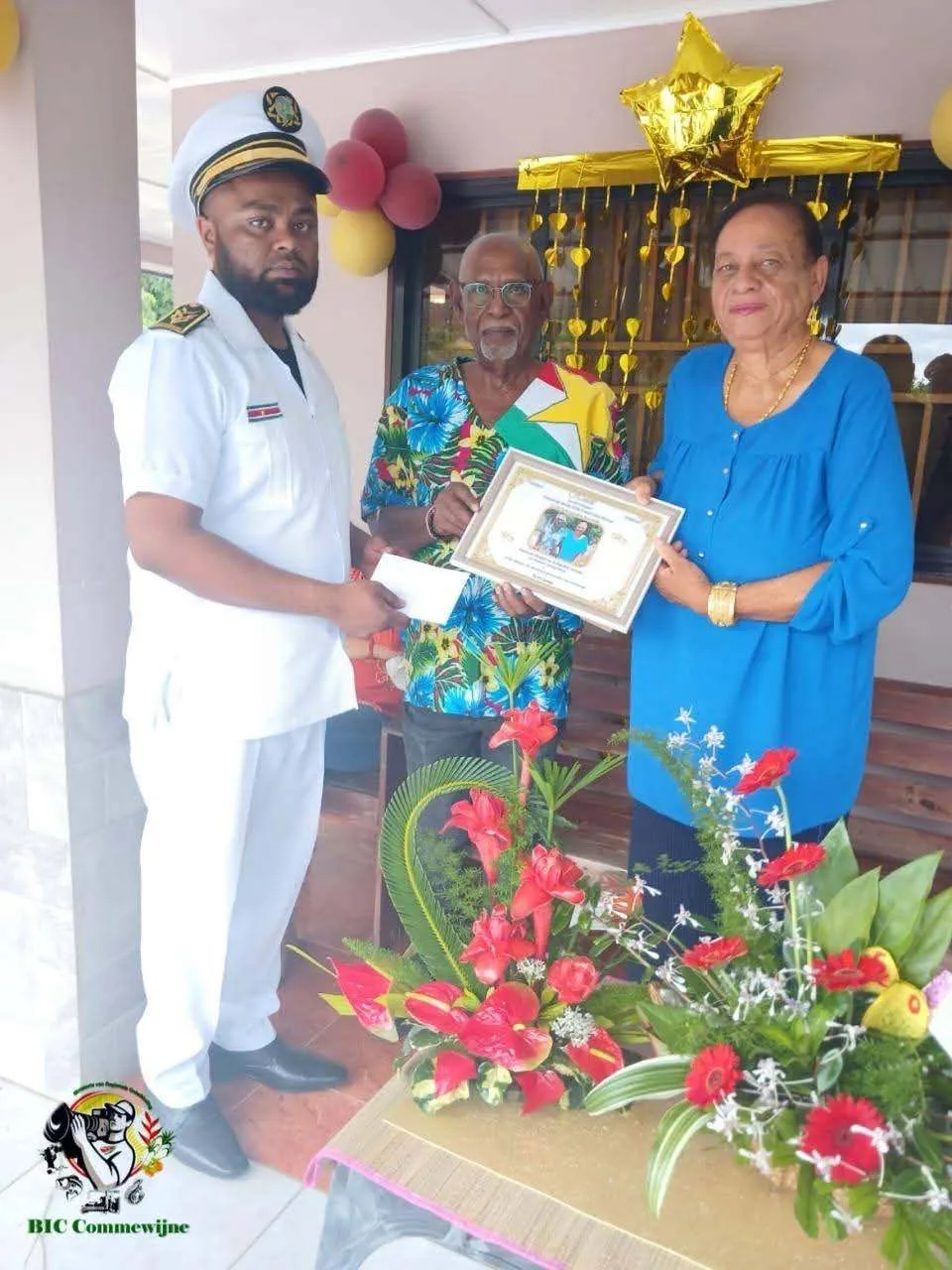 De districtscommissaris van Commewijne bracht namens de regering de felicitaties over en overhandigde een bloemstuk, een ingelijste foto en de gebruikelijke gesloten enveloppe met inhoud aan het jubilerende paar.