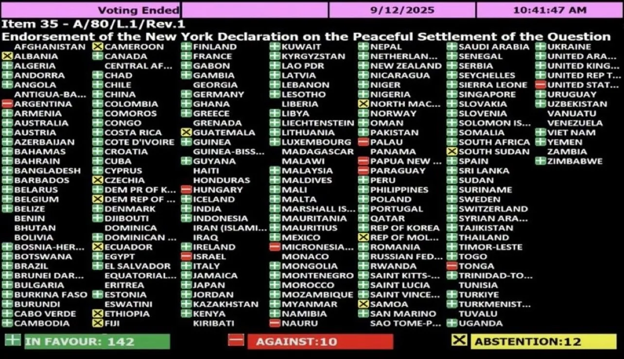 De Algemene Vergadering van de Verenigde Naties heeft vrijdag met een overweldigende meerderheid ingestemd met een verklaring die oproept tot “tastbare, tijdgebonden en onomkeerbare stappen” richting een tweestatenoplossing tussen Israël en Palestina.