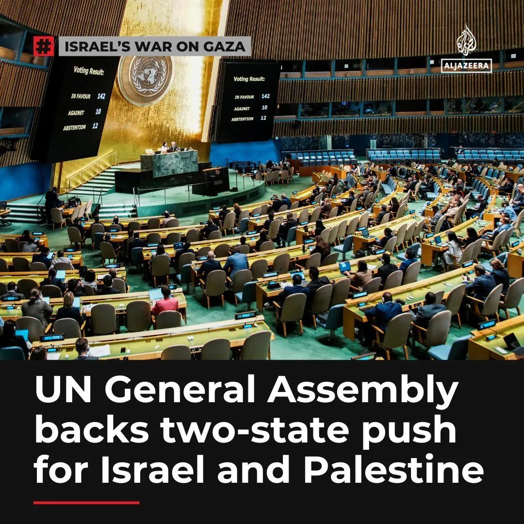 De “New York Declaration”, die “tastbare, tijdgebonden en onomkeerbare stappen” richting een tweestatenoplossing schetst, werd vrijdag aangenomen met 142 stemmen voor, 10 tegen – waaronder IsraĆ«l en de belangrijkste bondgenoot de Verenigde Staten – en 12 onthoudingen. Het zeven pagina’s tellende document, gepresenteerd door Frankrijk en Saoedi-ArabiĆ«, roept op tot “collectieve actie om de oorlog in Gaza te beĆ«indigen en een rechtvaardige, vreedzame en duurzame oplossing van het IsraĆ«lisch-Palestijnse conflict te bereiken, gebaseerd op de effectieve implementatie van de tweestatenoplossing”. Het draagt ​​de Palestijnse groep Hamas, die de regering in Gaza leidt, ook op om “alle gijzelaars vrij te laten” en stelt dat het “zijn heerschappij in Gaza moet beĆ«indigen en zijn wapens moet overdragen aan de Palestijnse Autoriteit … in overeenstemming met het doel van een soevereine en onafhankelijke Palestijnse staat”.