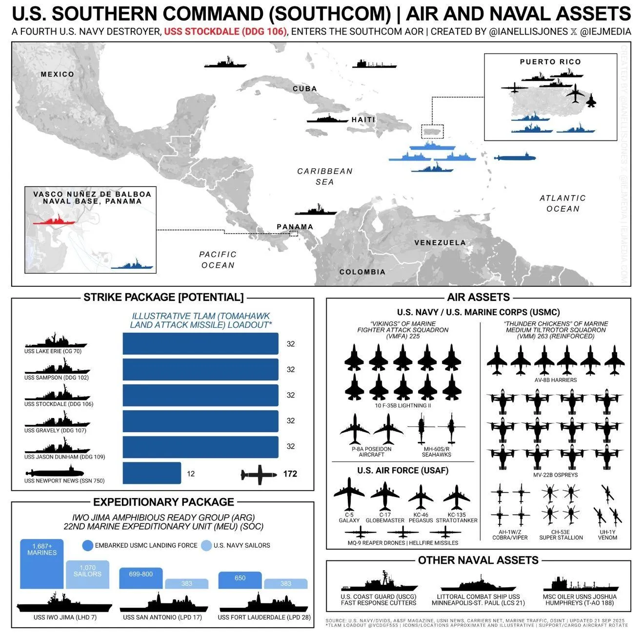 De aankomst van de Amerikaanse torpedobootjager USS Stockdale (DDG-106) in Panama op 20 september markeert een zichtbare uitbreiding van de Amerikaanse maritieme aanwezigheid in het SOUTHCOM-gebied. Naast multinationale oefeningen zoals UNITAS, met deelname van Argentijnse en andere marineschepen, voeren de VS intensieve patrouilles, oefeningen en antidrugsoperaties uit in het zuidelijk Caribisch gebied en de oostelijke Stille Oceaan.