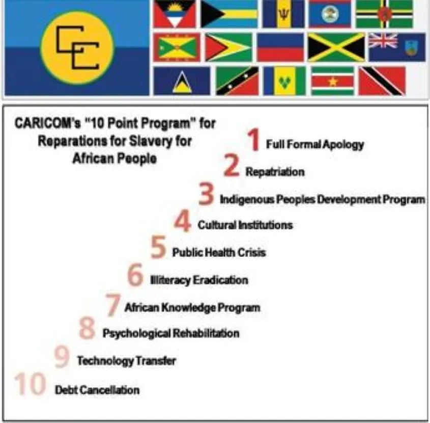 Het 10-puntenplan van de Caricom van reparations betreft geen cash betalingen aan personen. Het heeft te maken met formele excuses, kosteloze repatriatie waar gewenst, een Ontwikkelingsprogramma voor Inheemsen (via onderwijsbeurzen) en culturele instituten. De echte punten over herstelbetalingen gaan over de slechte openbare gezondheidszorg (een crisis) in de Caribbean, het wegwerken van ontwikkelings- en educatie-achterstanden, een African Knowledge Program, psychologisch herstel, technology transfer en het kwijtschelden van de hoge staatsschulden van de Caribische landen.
