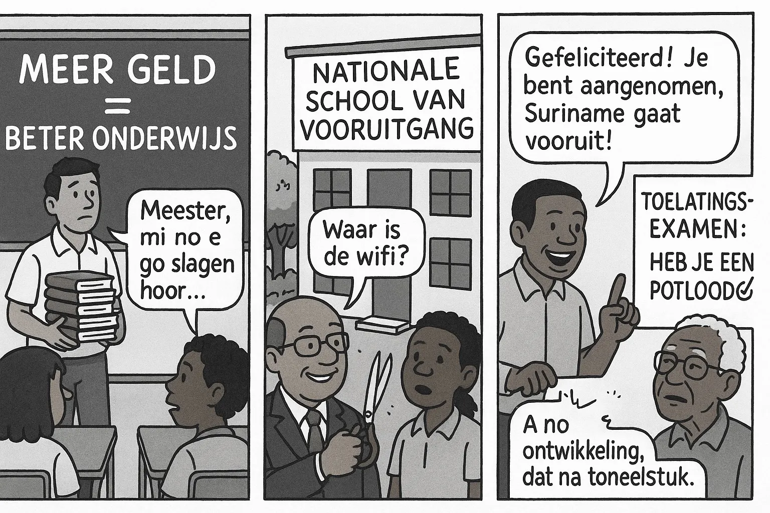 Maar dan komt iemand met het magische woord: “meer geld!”. Meer boeken! Meer lokalen! Meer toetsen! En ik denk alleen: meer stress bedoel je? In Suriname is het alsof de oplossing voor elk probleem in het onderwijs is: een nieuw gebouw openen met een lintje erbij en een minister die een toespraak houdt. De kinderen? Die zakken nog steeds massaal voor wiskunde.