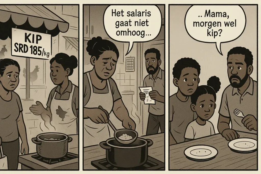 “Wat eten we vanavond?” Het lijkt een gewone vraag, maar in een huishouden in Paramaribo wordt het elke dag een confrontatie met de economie. Kippen waren ooit de goedkoopste en meest toegankelijke bron van proteïne. Vandaag is dat anders: een hele kip kost gemiddeld SRD 265. Voor velen is dat onbetaalbaar.
