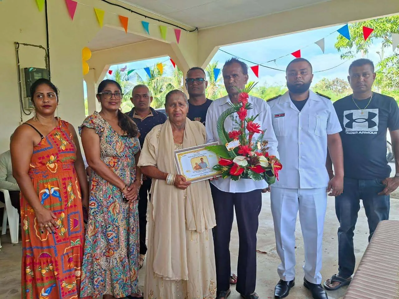 Districtscommissaris Rajiv Ramsahai van Commewijne bracht namens de regering de felicitaties over. Het echtpaar ontving een bloemstuk, een ingelijste foto en de gebruikelijke gesloten enveloppe met inhoud.