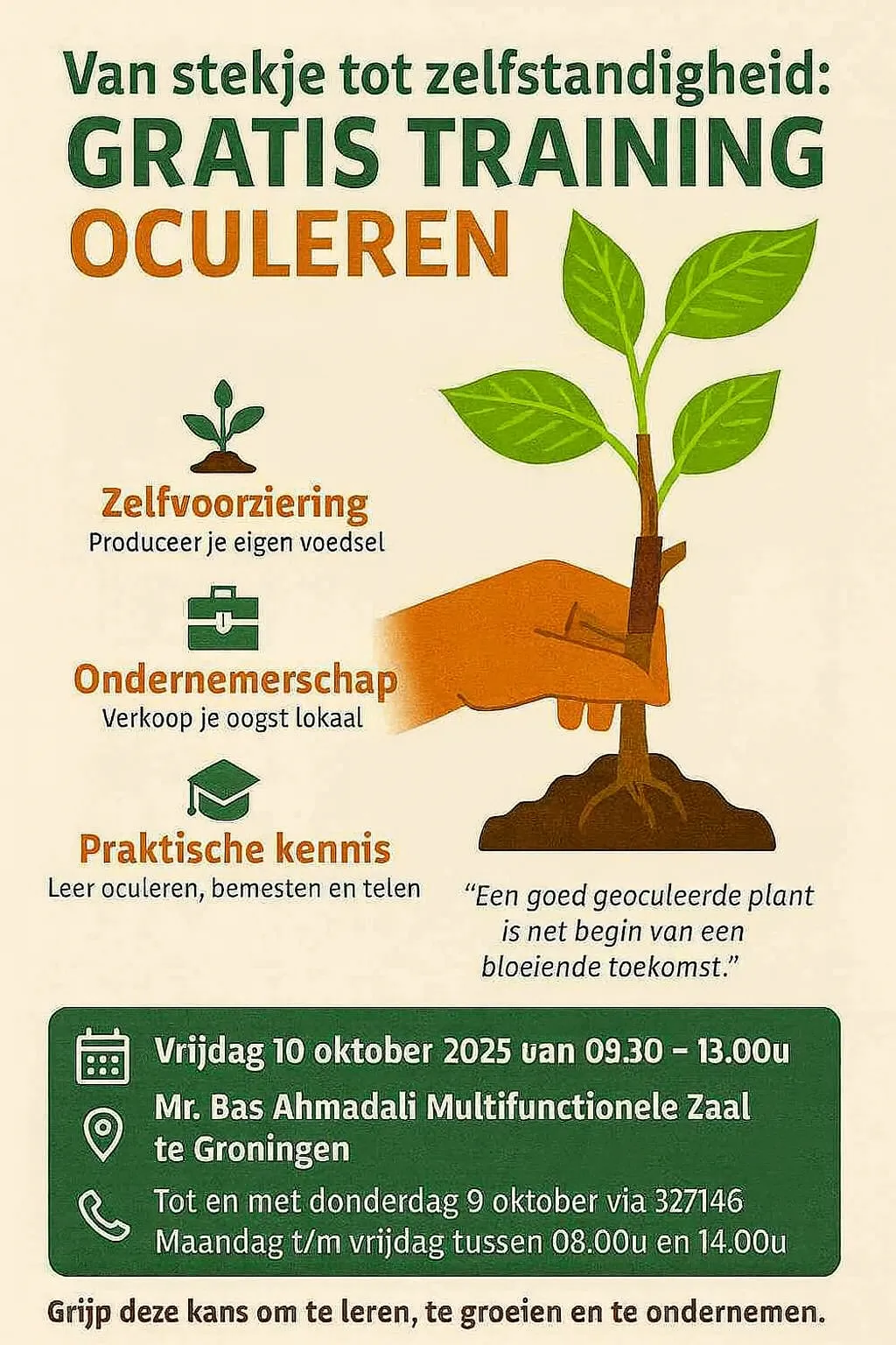 Onder begeleiding van landbouwdeskundige Imro Orie zullen deelnemers leren hoe ze planten kunnen oculeren en wat de voor- en nadelen daarvan zijn. Oculeren is een techniek waarbij een knop van een gewenste plant wordt ingeplant op een sterke onderstam. Het resultaat? Sneller groeiende, sterkere, gezondere en beter producerende planten.