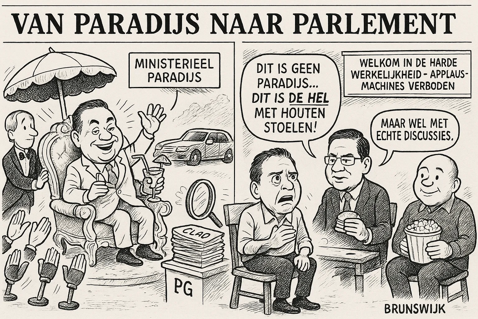 Dat hij Santokhi en Brunswijk verantwoordelijk houdt voor zijn politieke val, maakt de soap compleet. De ironie: hij zit nu weer schouder aan schouder met Brunswijk in de coalitie, alsof niets gebeurd is.