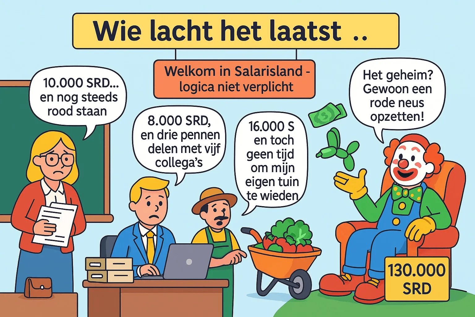 In Suriname wordt er soms hard gelachen – maar niet altijd om de juiste redenen. Een leerkracht ploetert voor 10.000 SRD, een ambtenaar voor 8.000 SRD, en de tuinman schoffelt zich krom voor 16.000 SRD. Ondertussen verdient de clown, zonder huiswerk na te kijken of gras te maaien, een duizelingwekkende 130.000 SRD.