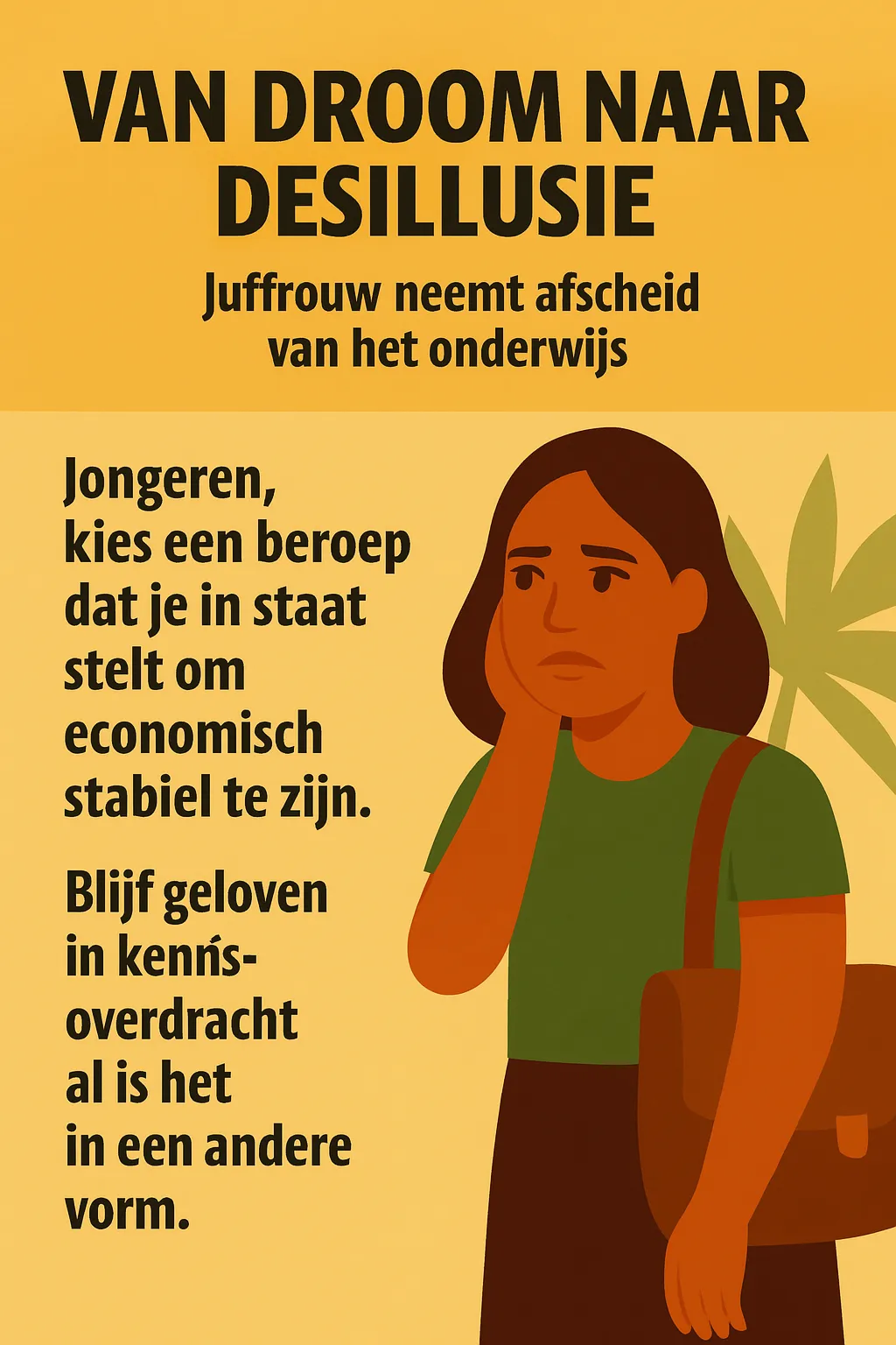 Maar haar droom botste uiteindelijk met de harde realiteit van het Surinaams onderwijssysteem: een onaantrekkelijk salaris, een gebrek aan stimulerende leeromgevingen, goede begeleiding en consistente controle, verouderd lesmateriaal, en miscommunicatie tussen betrokken actoren.