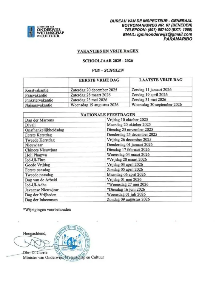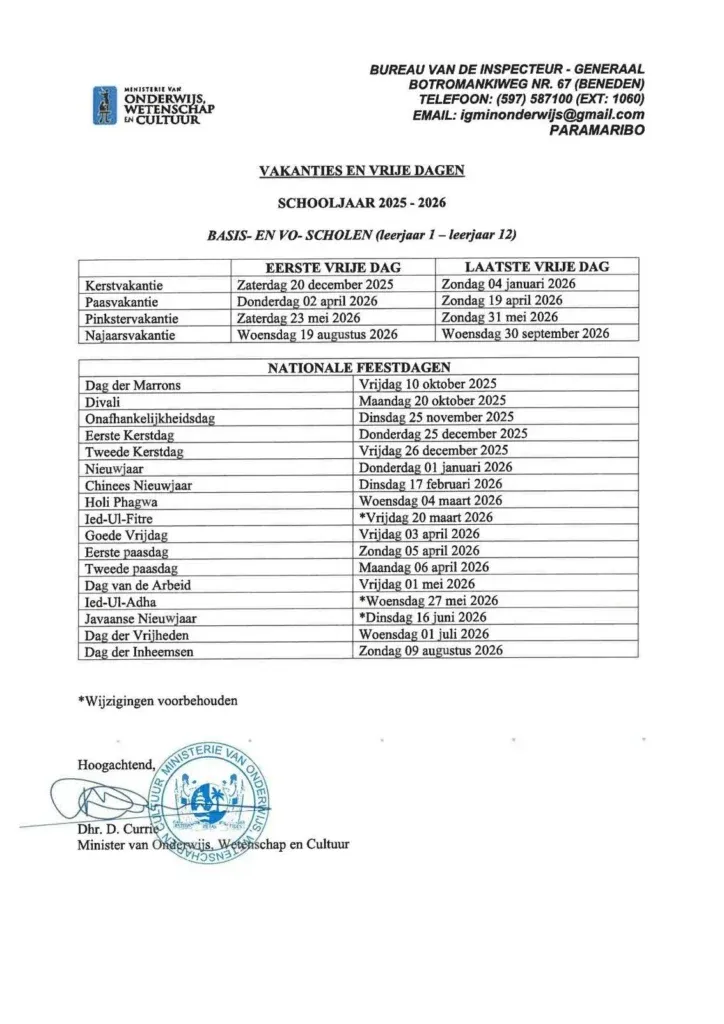 Het ministerie van Onderwijs, Wetenschap en Cultuur (minOWC) heeft enkele wijzigingen aangebracht in de eerder vastgestelde vakantiedata.